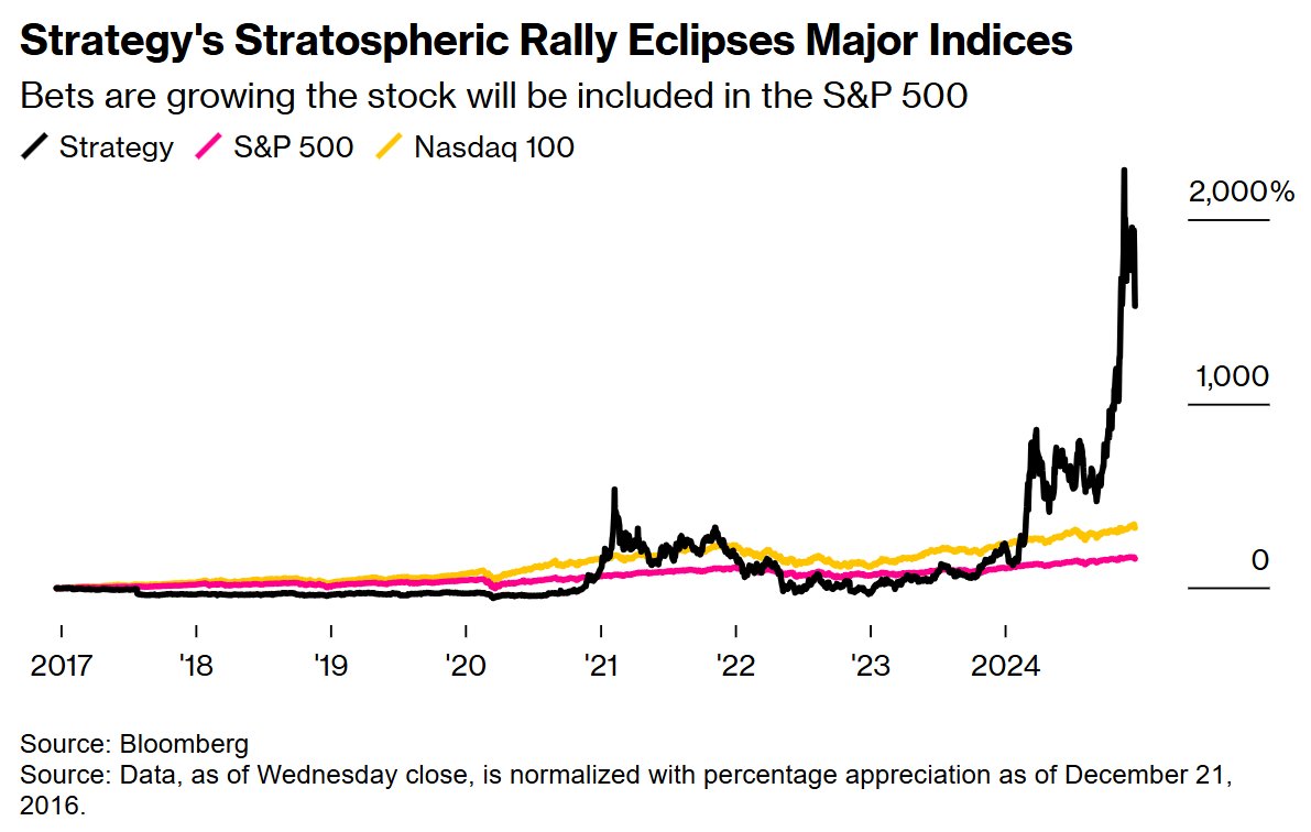 尽管MicroStrategy已于去年12月入选科技股权重高的纳斯达克100指数,但标普500无疑是更大舞台——其资产规模近乎翻倍,有近10万亿美元被动基金追踪。塞勒本人去年曾宣称2025年可能成为入选标普500的年份。
